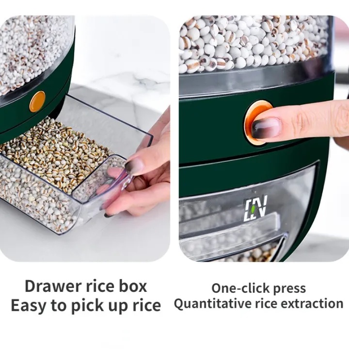 The Cereal Storage Box has strong sealing and can prevent moisture and dust. 6-Grid Rotating Grain Dispenser has a simple and elegant appearance. The key design is convenient to control and store whole grains such as rice, oat, mung bean, candy, and dry food.