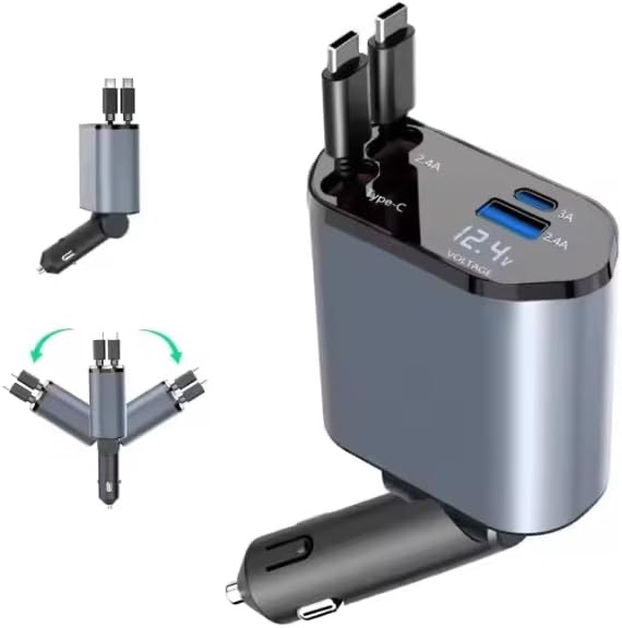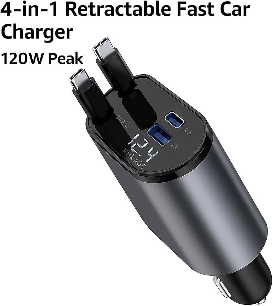 Home » 4-in-1 Retractable Fast Car Charger 120W Peak | Dual USB-C & USB-A PD/QC | LED Display | Universal In-Car Phone Charger for iPhone 16 15 14, Samsung S24, iPad, Android Tablets