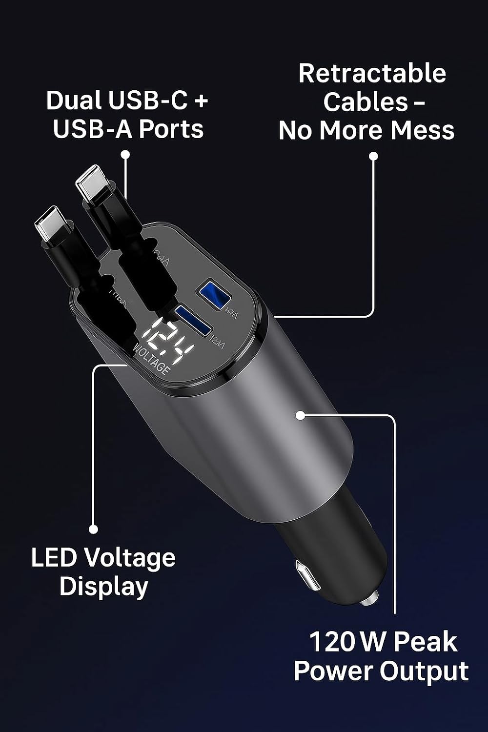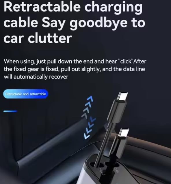 - Retractable Cable Design – Two built-in pull-out cables keep your dashboard clutter-free. Say goodbye to tangled wires and messy glove compartments.