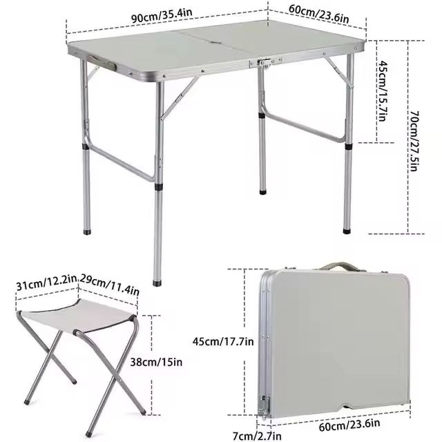 The table cover is plastic. The chairs are covered in polyester. Frame – aluminum pipes with a diameter of 22 mm and 25 mm. A lightweight and compact folding table is an excellent option for traveling. It is perfect for a summer cottage or an outdoor picnic.
