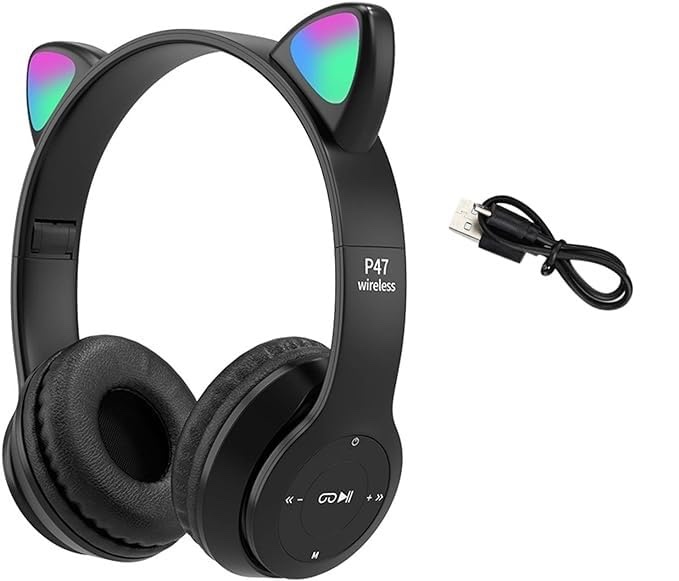 Cat Ears KT-49M Wireless Gaming Headset, LED Light Up Cat Ear Headset, Stereo Bluetooth Headset, for Kids and Adults, Over Ear (Black, KT-49M) Fs