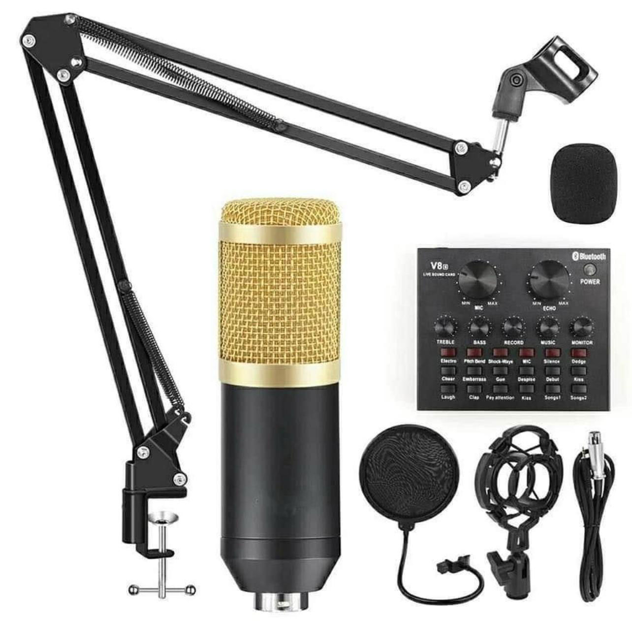 - Package Includes Bm800 Microphone, NB35 Boom Arm Stand, Pop Filter, V8 Sound Card, Audio Splitter, Shock Mount, XLR Cable