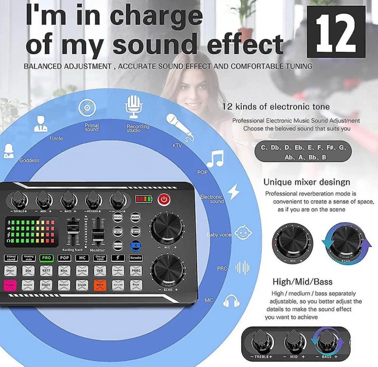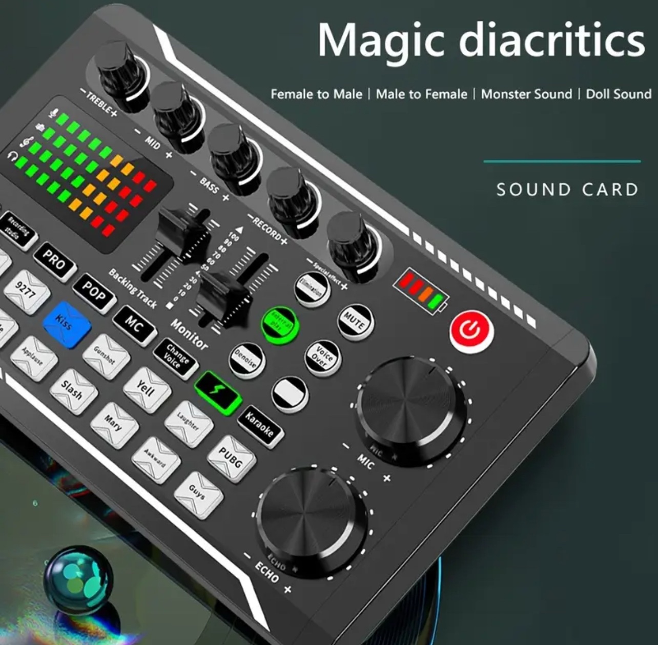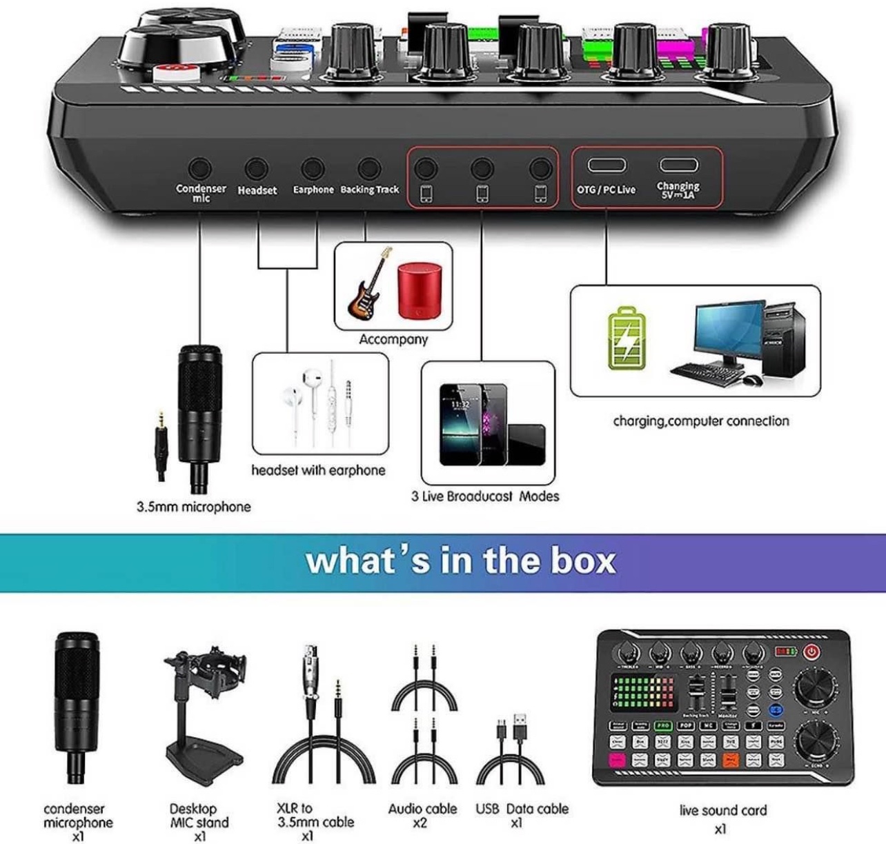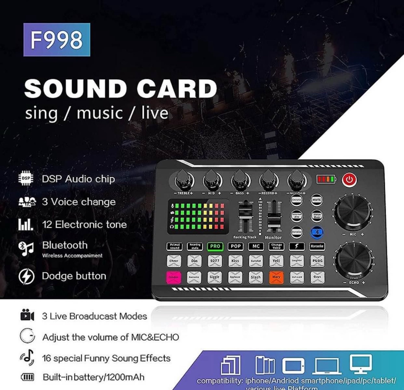 F998 is a live sound card with DJ mixing effects and a voice changer, as well as a wired microphone audio interface. It is a podcast production studio equipment and is very suitable for live streaming/podcasting/gaming