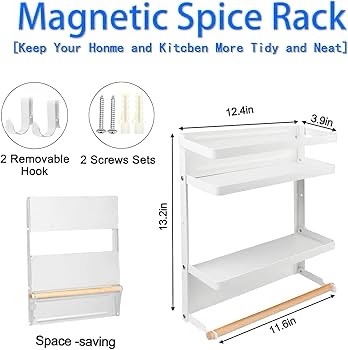 Fridge Spice Rack, Magnetic Shelf with Paper Towel Holder 2 Tier Kitchen Refrigerator Storage Rack (White, Medium Dc