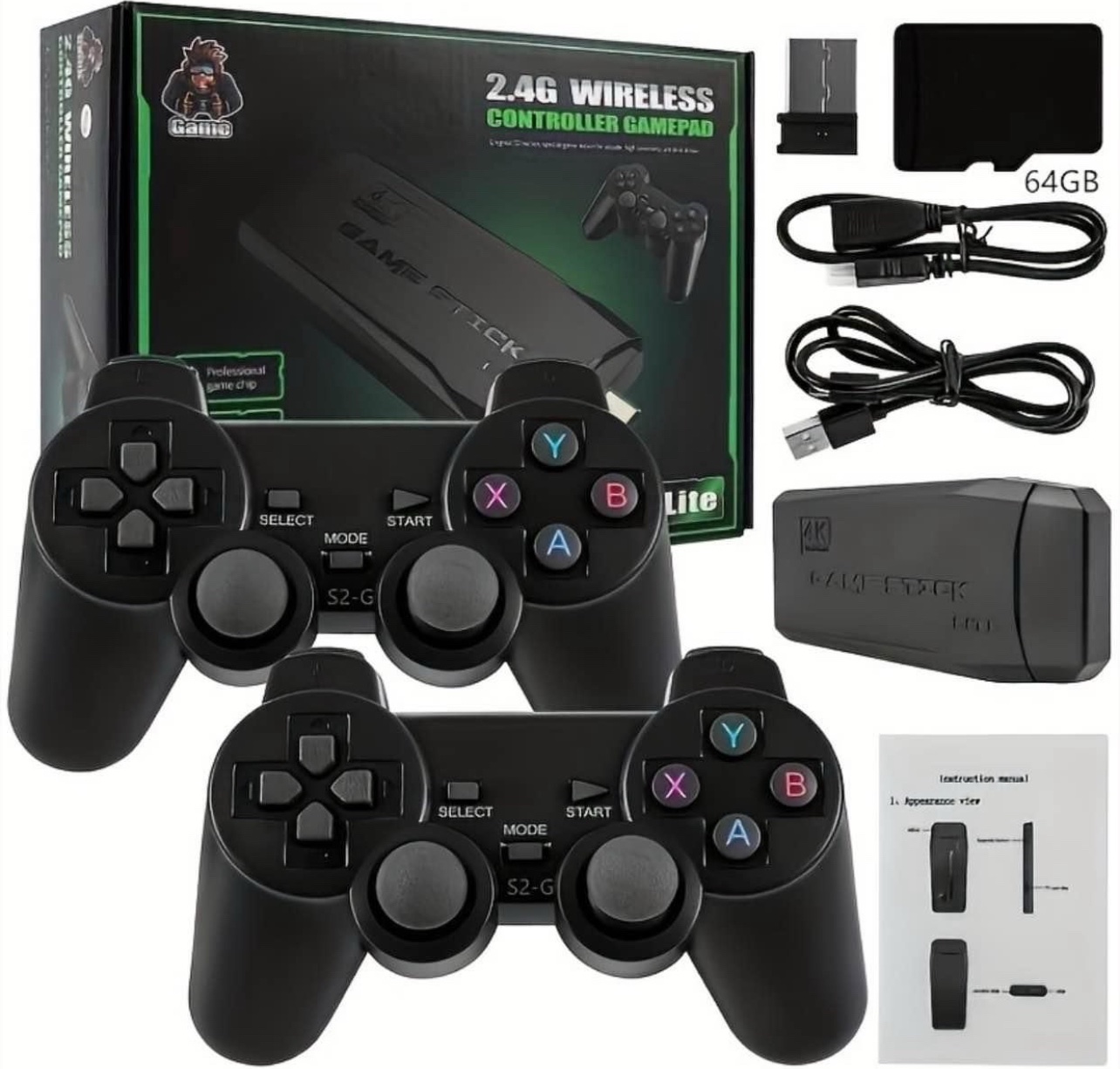 Asmvt Smart gaming chip: Wireless TV game console integrated into more than 10000 games, more than 9 emulators are installed, and a 64GBTF card is attached that allows you to save and read game logs. It uses updated game chips to support 8-bit, 16-bit, 32-bit, 64-bit, 128-bit emulators. It perfectly meets your needs for image quality and game fluency. 2.4GHz wireless controllers, compatible with two player games: equipped with two 2.4G wireless joysticks, sensitive without delay, get rid of thread shackles. The connection distance of the controller is 8 to 10 meters, connect and play, comfortable feeling, you can better enjoy the fun of classic nostalgic games with family or friends. HDMI Output: This gaming console supports HDMI connection, make sure your display has an HDMI input port. It has 1080P HD picture quality, and you can enjoy animated and interesting video games on the big screen. Lightweight and easy to carry: The portable mini game console has a lightweight and compact body. Only 102 mm long, 30 grams of weight. It does not take up space, and is easy to carry. Special rocking chair for arcade games, high sensitivity and non-slip design, comfortable feeling, you can better share your fun with family or friends. BEST GIFT: The game console is a perfect gift for festivals, Christmas, Thanksgiving, Halloween, birthdays for men, kids, parents, husbands and friends. It will allow you to share your happy childhood with them. Black. Asmvt.