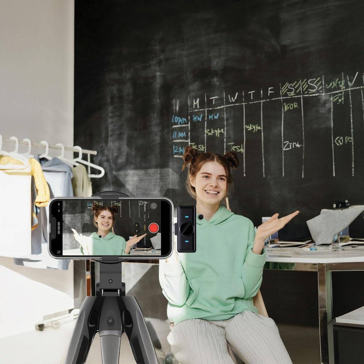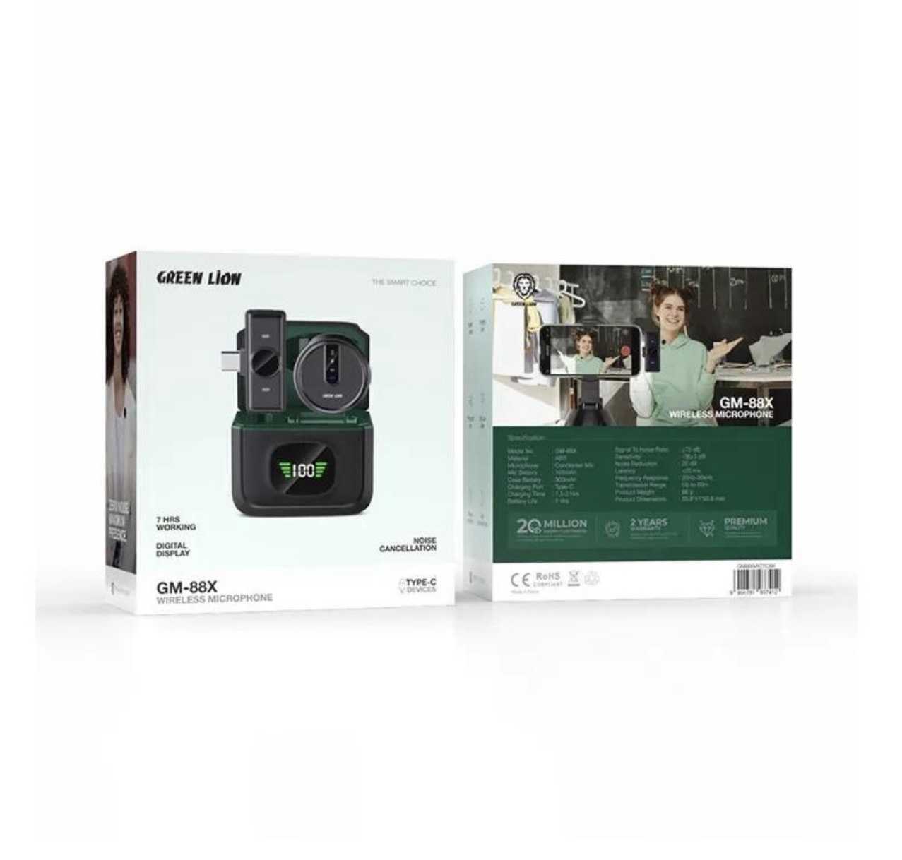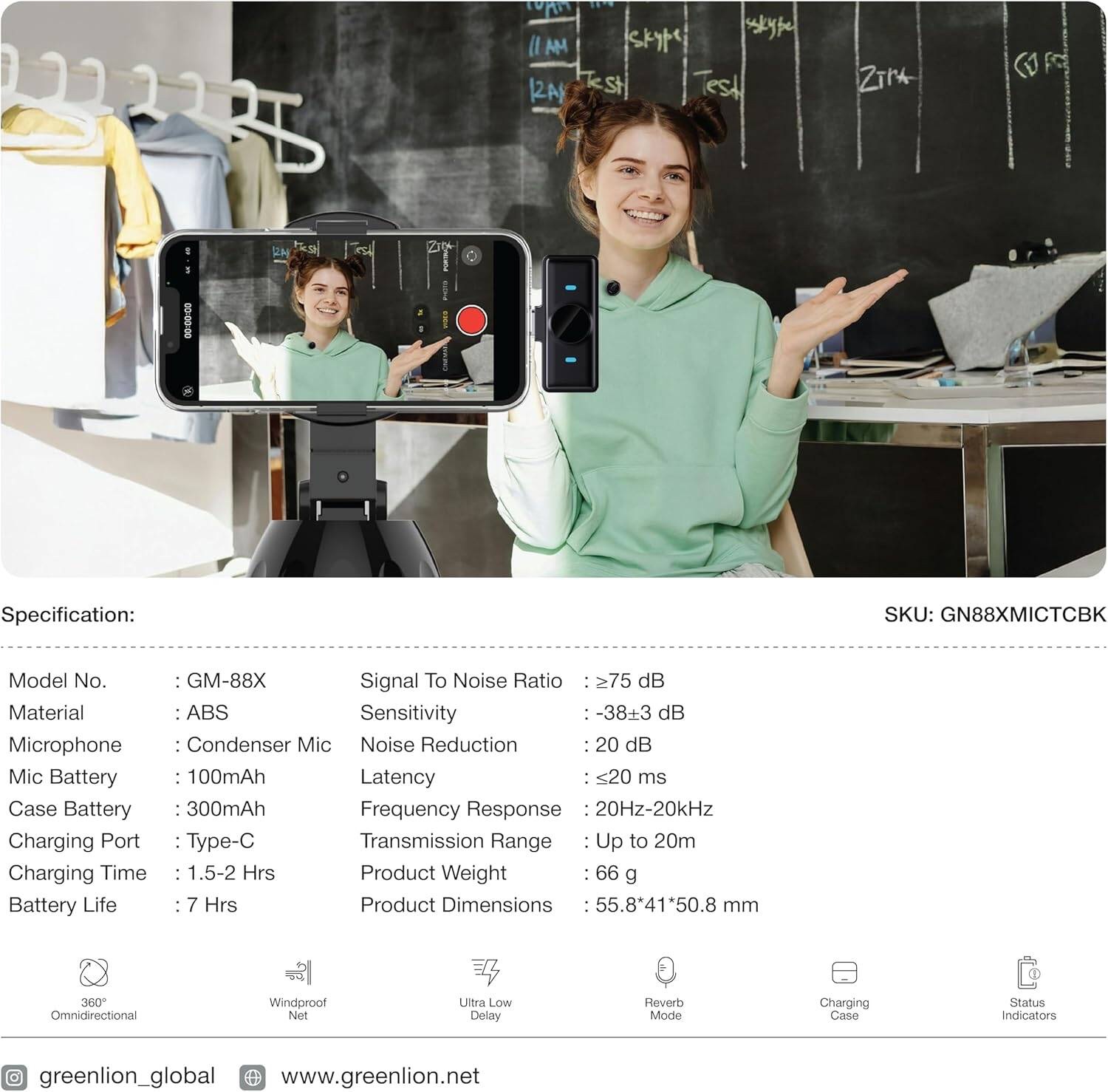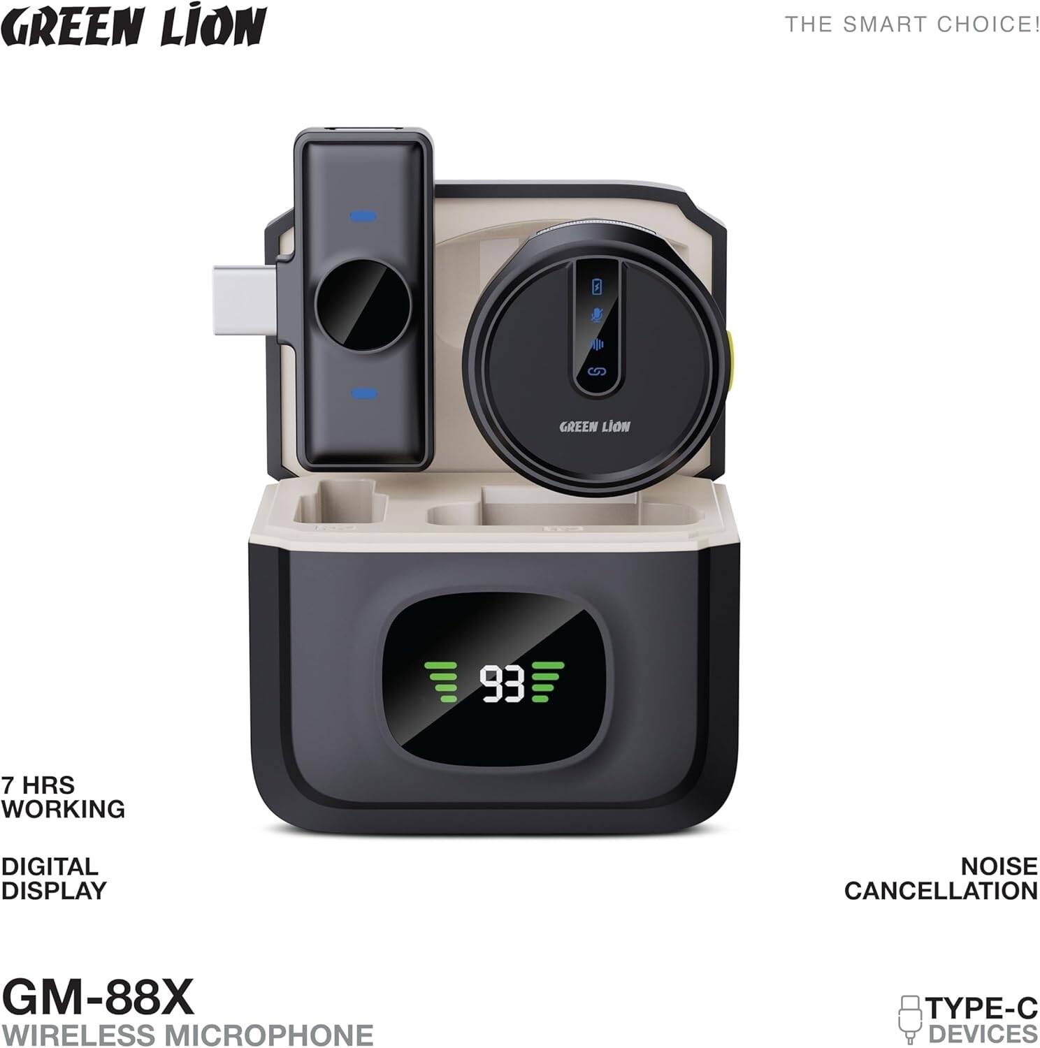 Green Lion GM-88X Wireless Microphone, USB Type-C Connector, Noise Cancellation, Digital Display, 7H Working Time, Windproof Net, Reverb Mode, 360 Omnidirectional Mic – Black