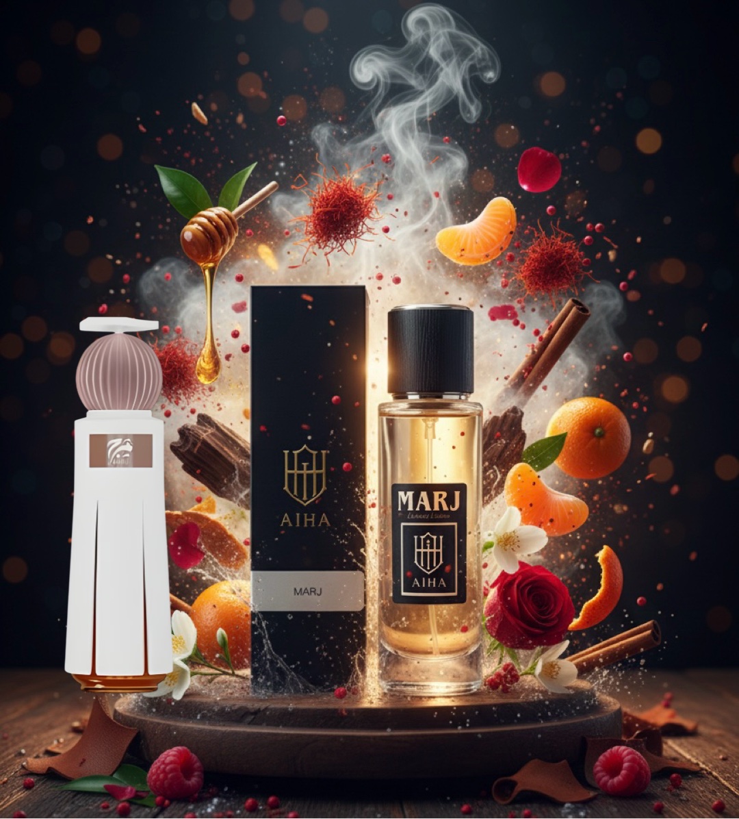 Marj by Ahmed Al Maghribi is a fragrance for women and men. Marj was launched in 2023. Top notes are Honey, Oud, Pink Pepper, elemi, Nutmeg, Bergamot and Mandarin; middle notes are Cashmere Wood, Orange Blossom, Saffron, Jasmine, Cinnamon, Patchouli and Vetiver; base notes are Agarwood, Saffron, Leather, Raspberry, Ambergris, Amber, Oakmoss, Sandalwood, Musk, Violet and Pear.