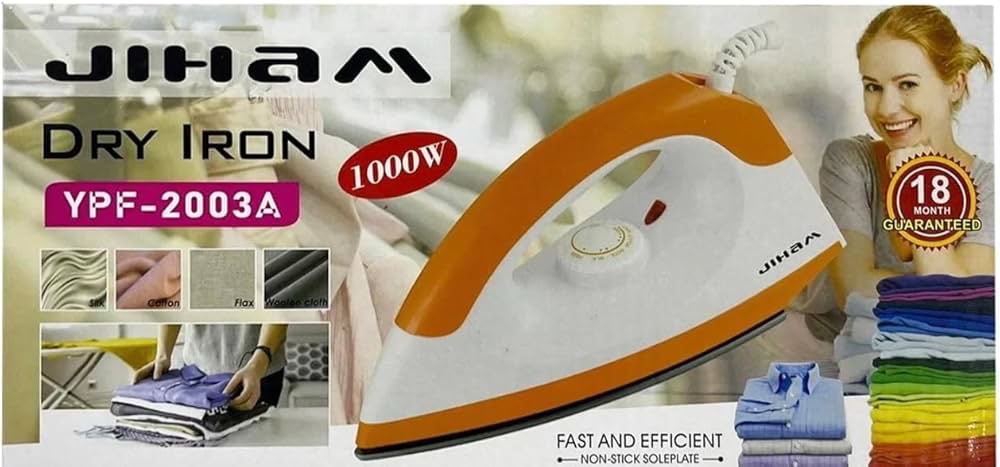 - Steam Dry Iron Box (1000W) YPF-2003A Variable Temperature Control Power On Indicator Lamp Stable Heel Rest Ergonomic Design Handle Is Comfortable For Hand Hold Flexible Cord Non-stick Coating Soleplate 220-240V~50Hz 1000W