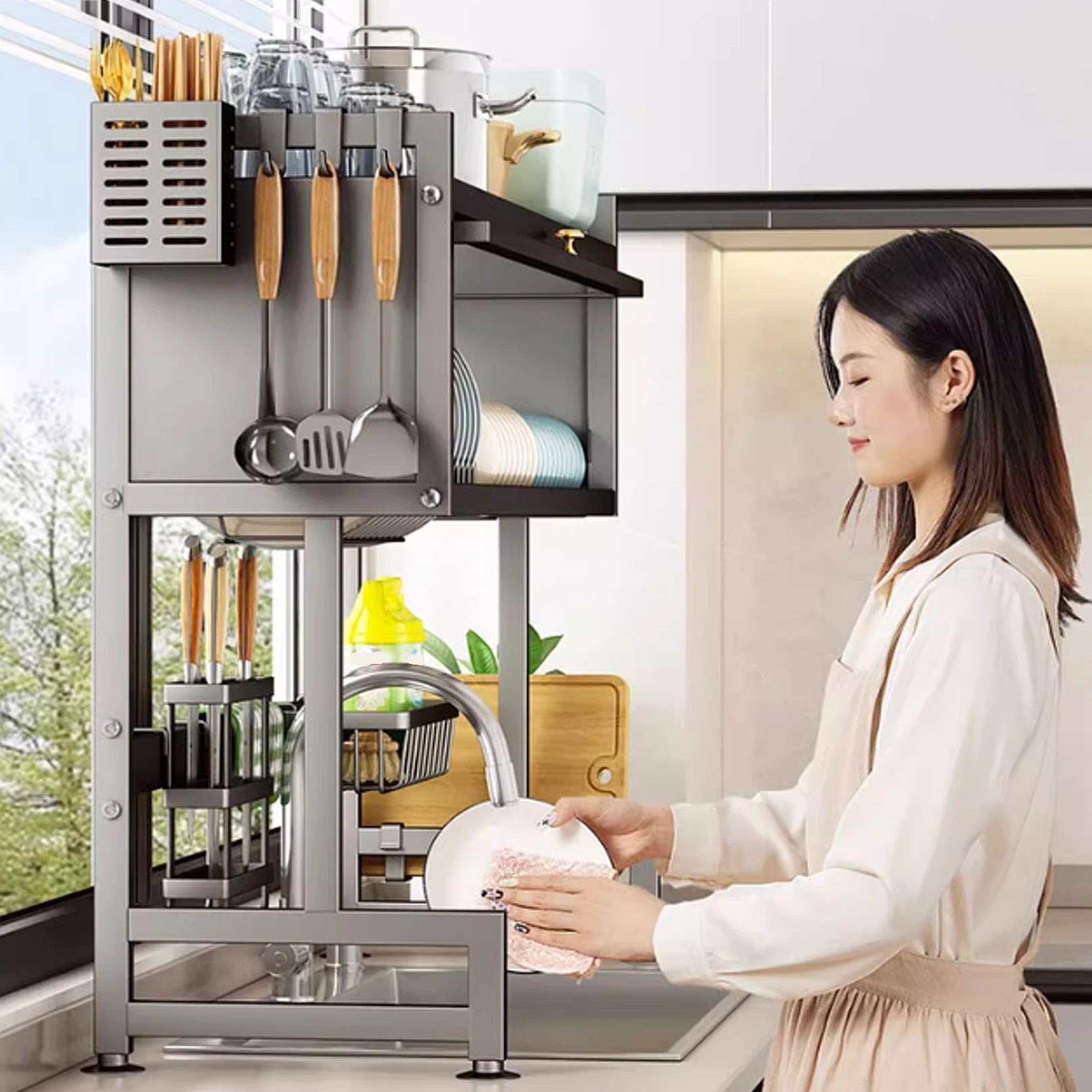 Tags: 3 Tier Carbon Steel Drainer Rack with Utensil Holder Dish Drainers for Kitchen Counter, Gray, Over Sink Kitchen Dish Drying Rack with Visible Door