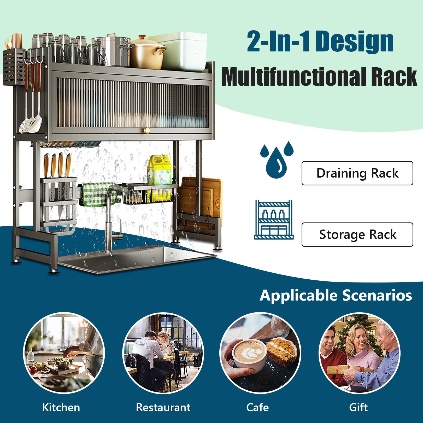- 2-in-1 Over Sink Dish Rack】Kitchen Dish Drainer, put the washed dishes on the rack, the water will flow directly into the sink; Kitchen Organizer, three-dimensional space above the sink for storing daily cookware and spices, etc., make your kitchen more clean and tidy.