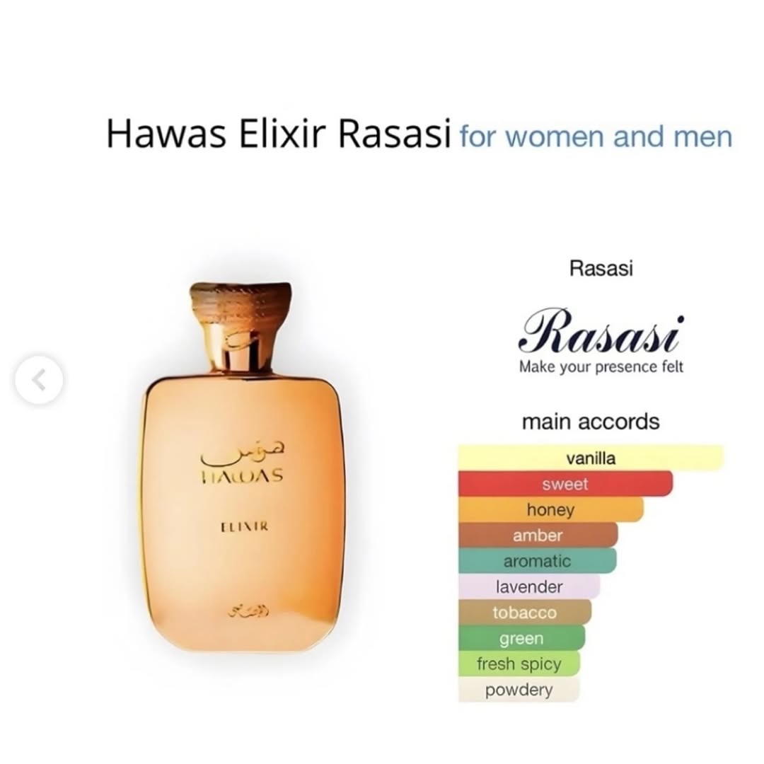 Designed for evening wear, Hawas Elixir is the perfect companion for men who embrace sophistication with a bold edge. Its luxurious trail captivates and leaves an unforgettable impression, making it an essential signature scent for those who dare to stand out. 💫