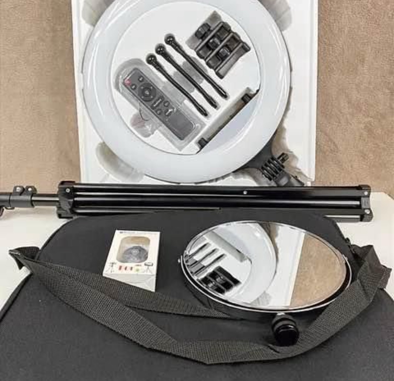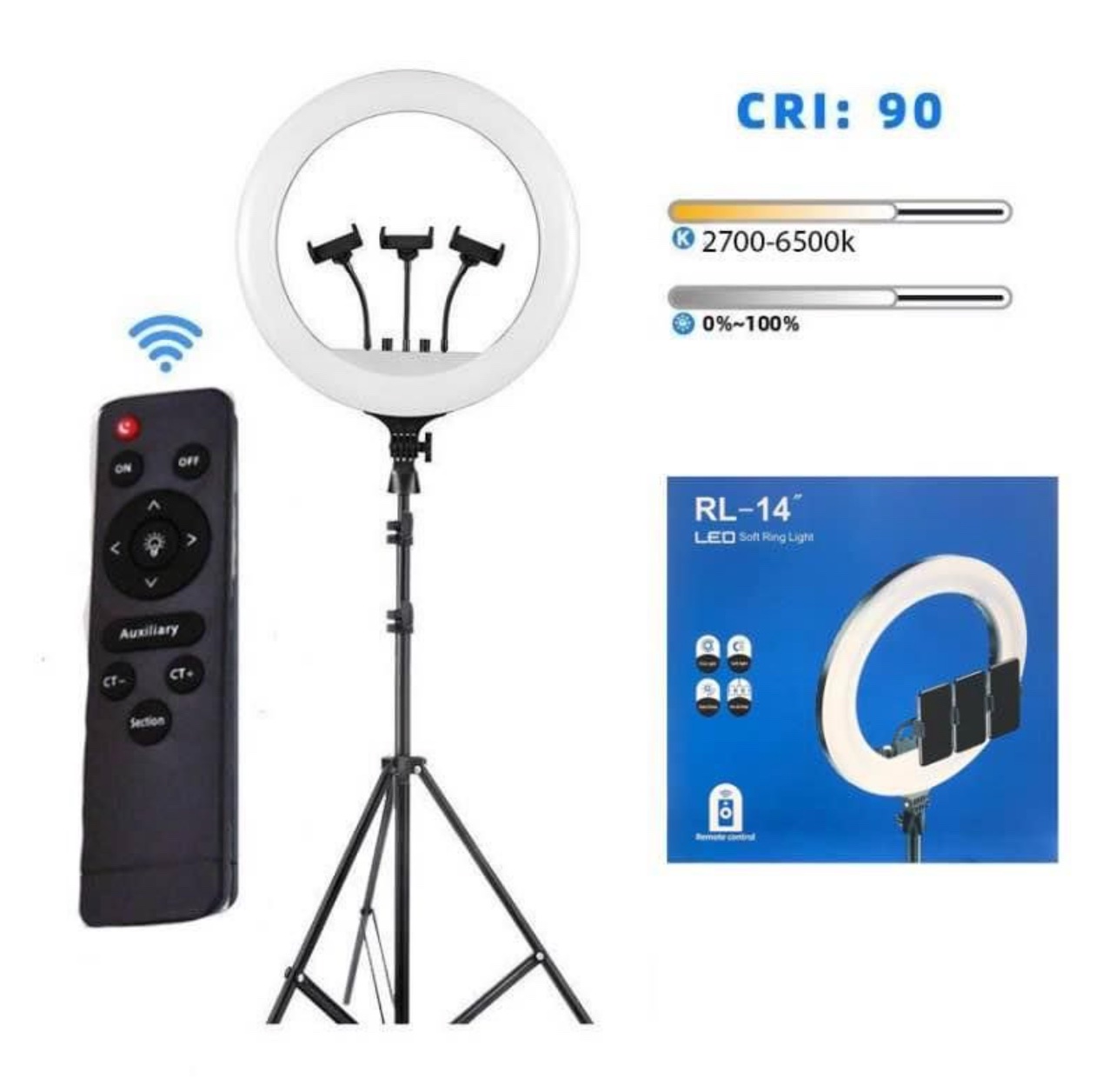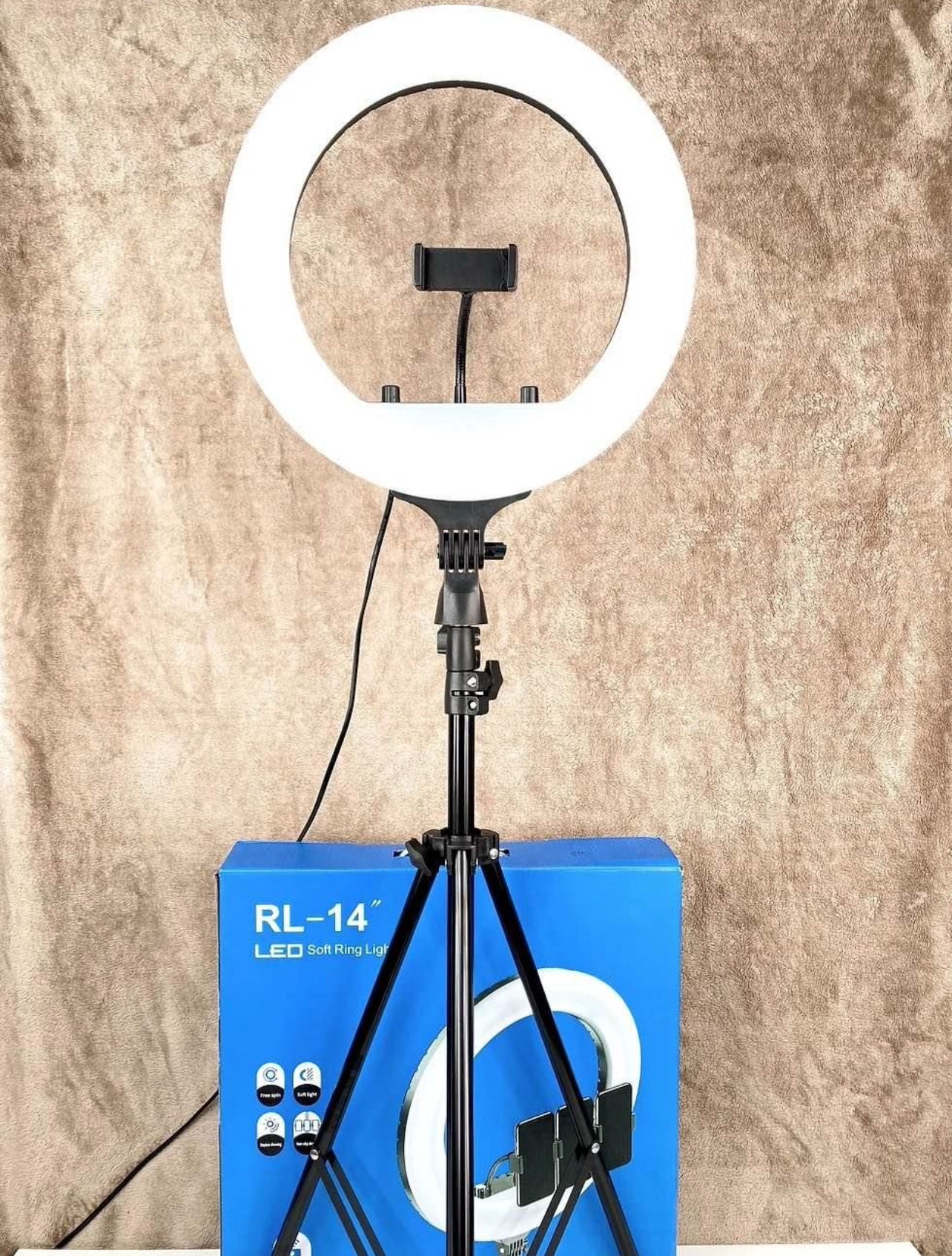 Ring light RL-14 is a semi-professional ring. Despite the small size, the light intensity is enviable! This model comes in a set with a large 2.1 m tripod, remote control for light control, bluetooth remote shooter, 3 phone stands of all sizes, a mirror and a canvas bag.