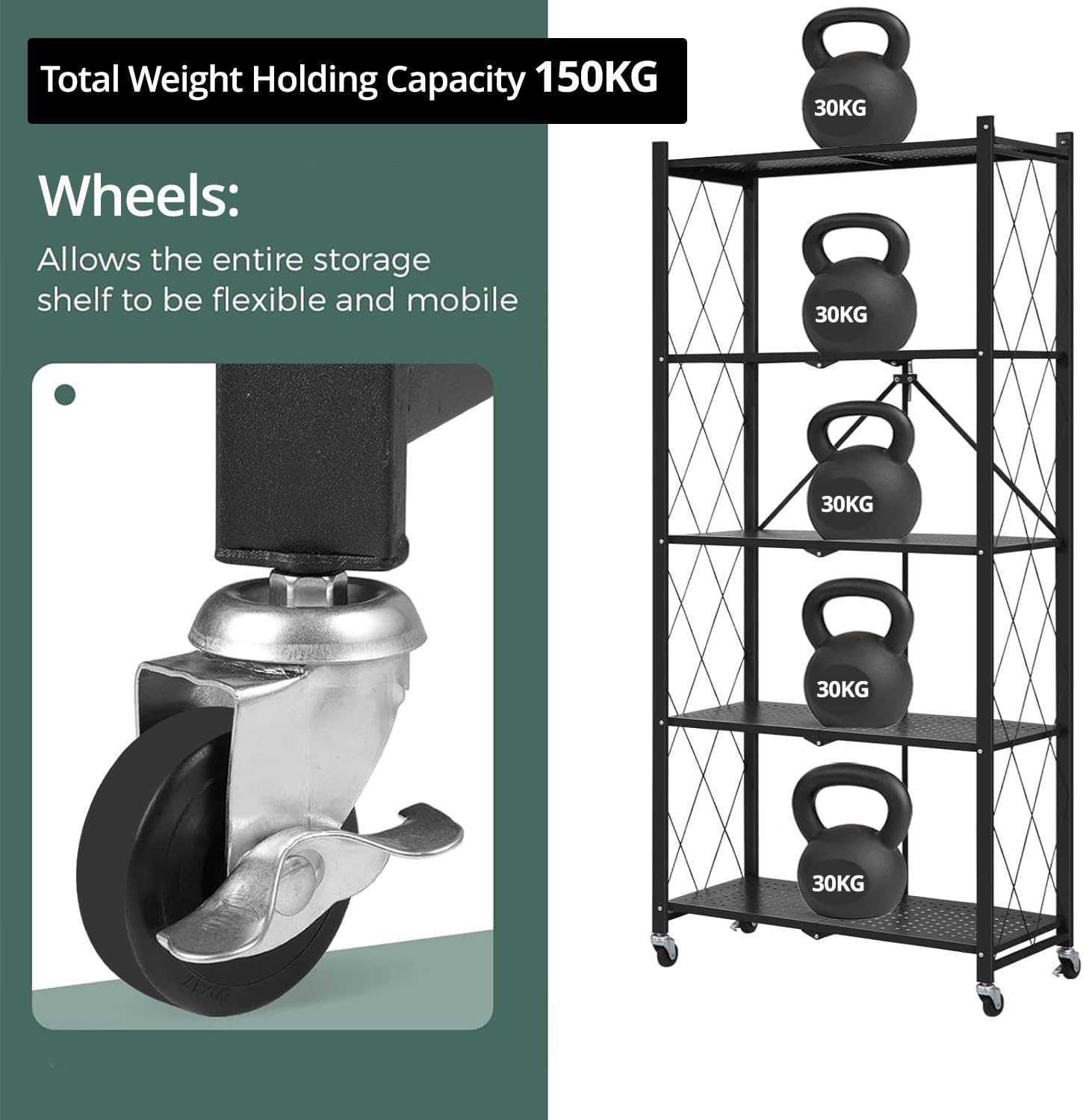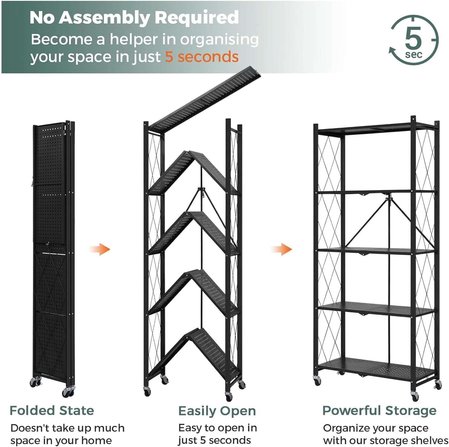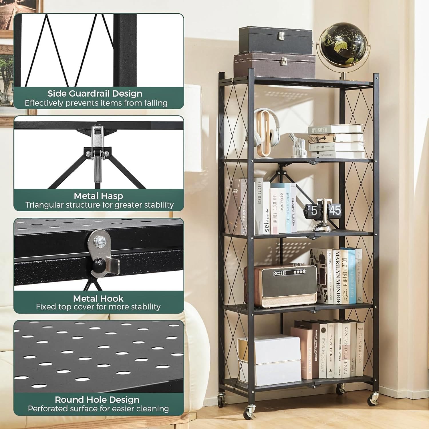 • KITCHEN RACK: Foldable multi-purpose 5-tier tall unit for kitchen is designed with wheels & breathable hollow design to hold books, magazines, plants and collectables perfect for the school, office, and home. Elegant and modern design that fits well and will be a reliable storage solution