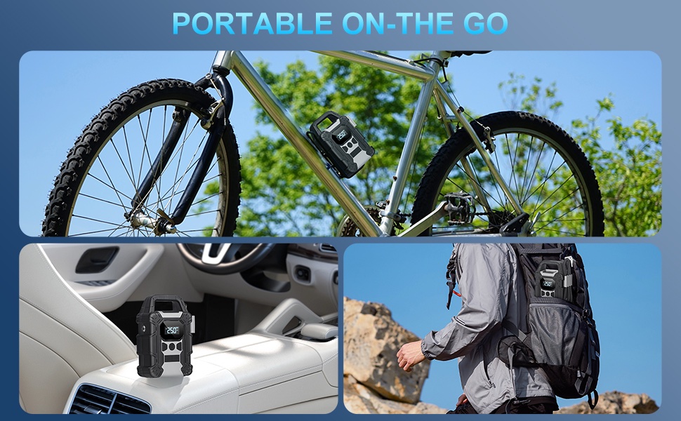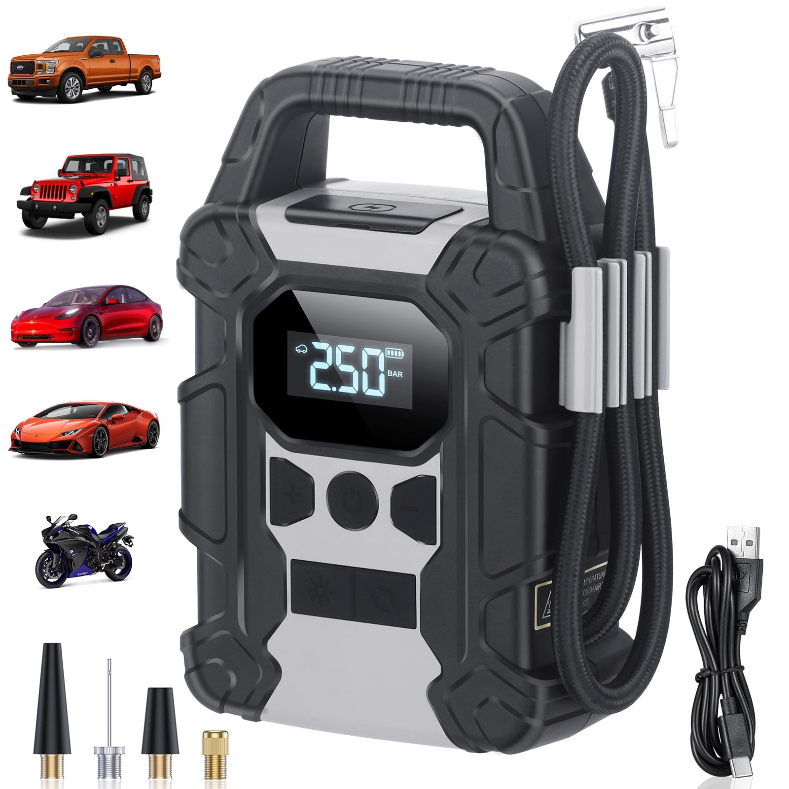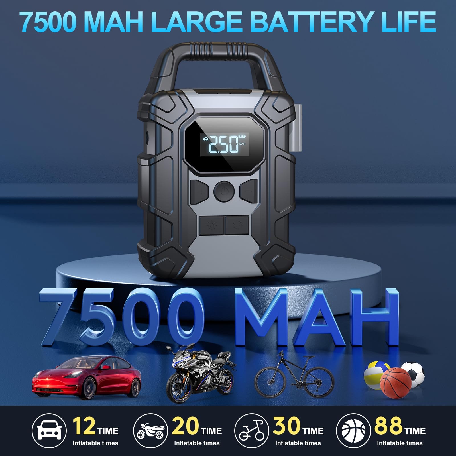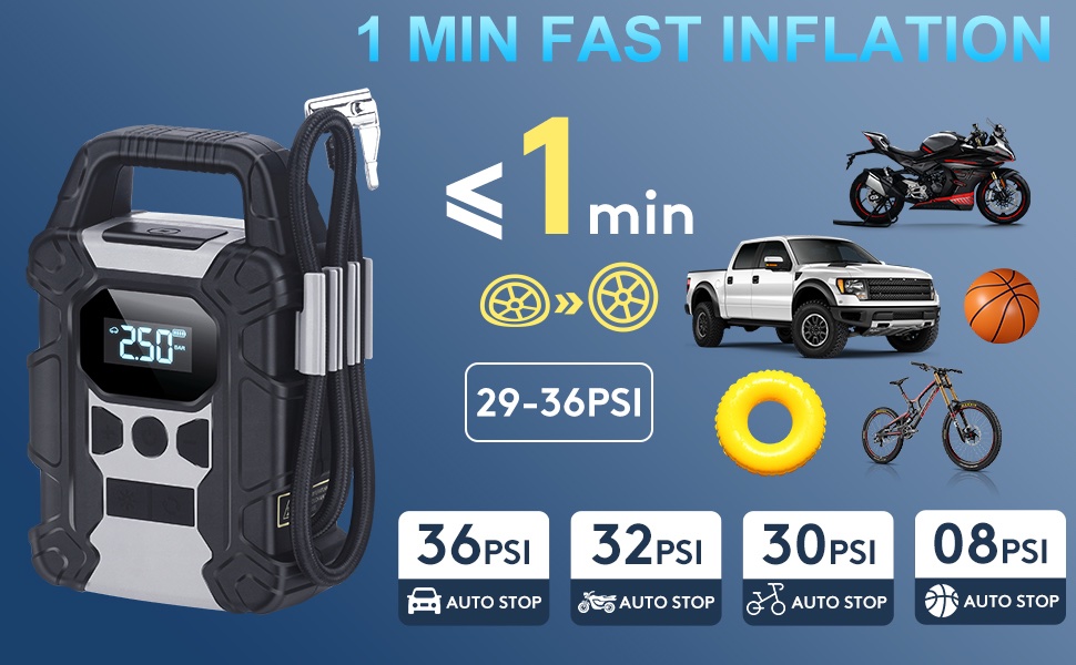 - 4 Modes & One Click Preset: Just push of a button, easily change between PSI, kPa, BAR, KG/CM pressure unit. 4 preset inflation modes (bicycles, motorcycles, cars, and balls), with an auto shut-off when the preset value is reached. Easy to read large LCD display. Nozzles stores inside, Powerful 7500 mAh rechargeable battery with fast recharging.