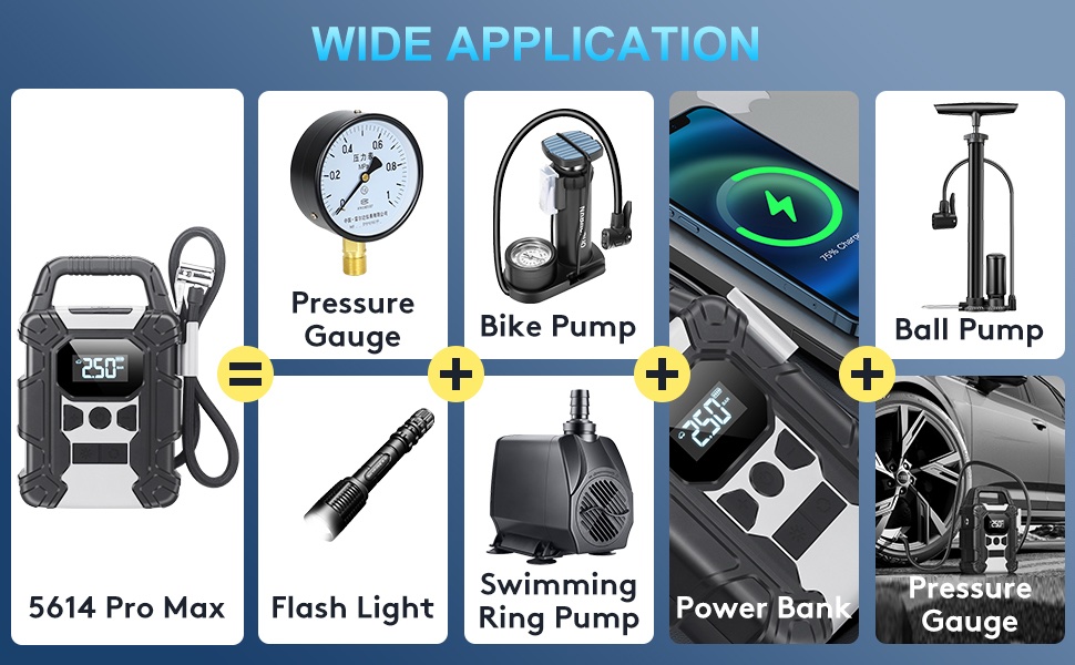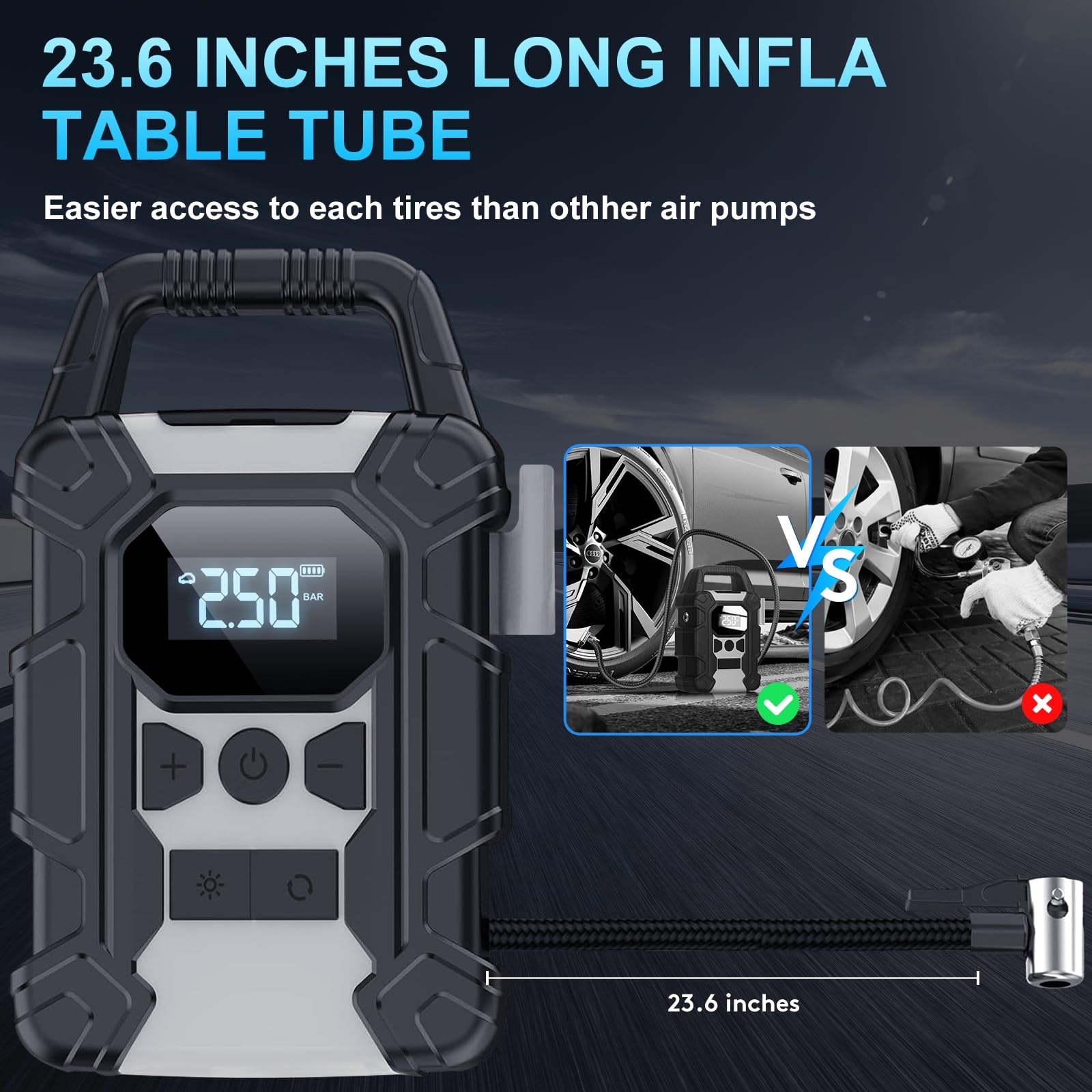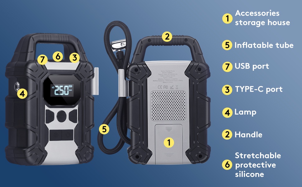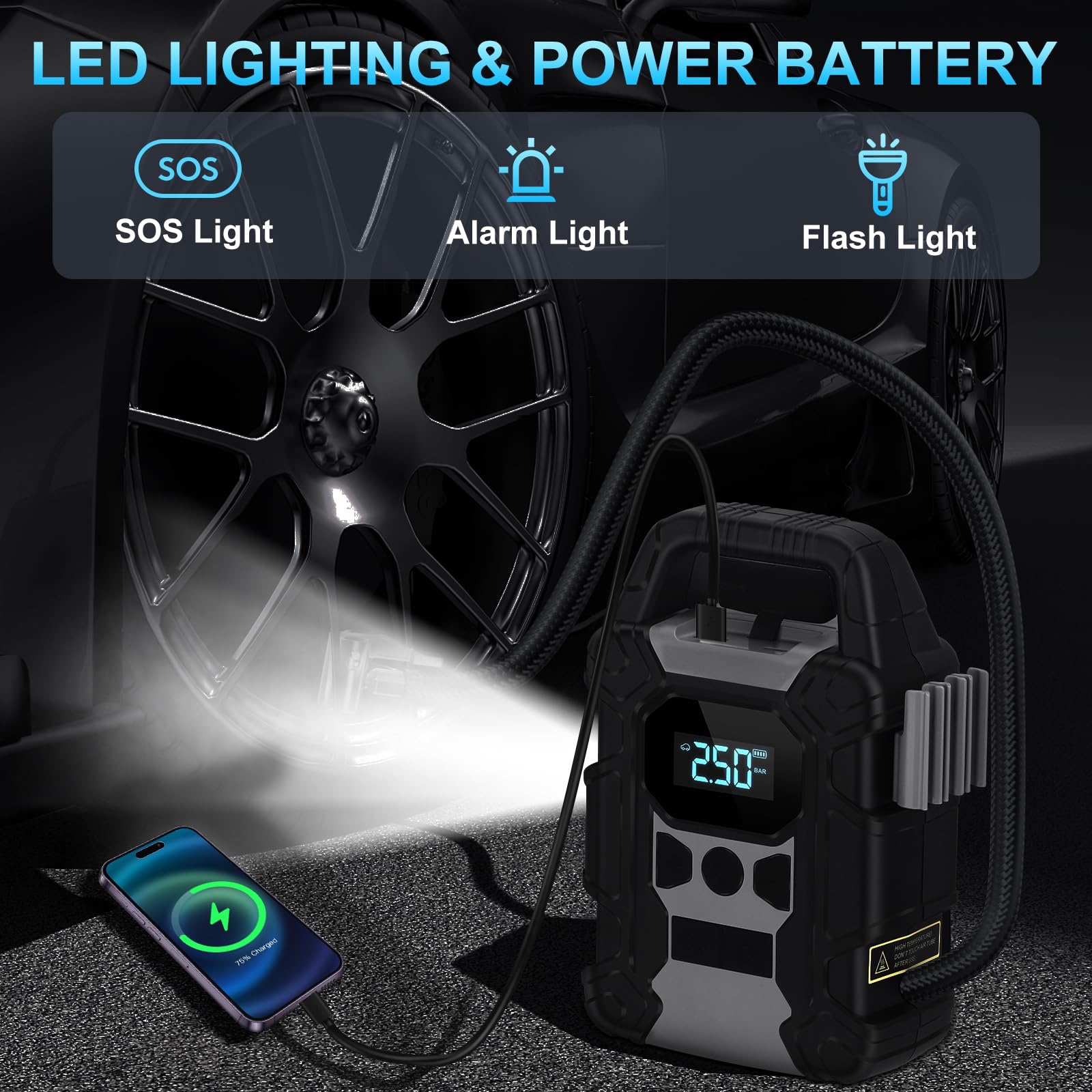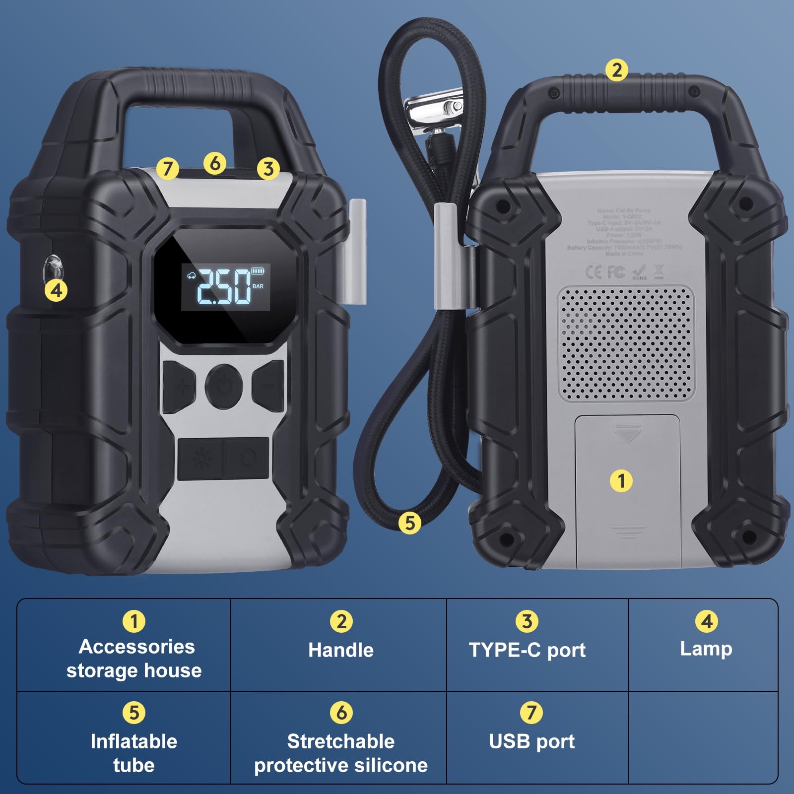 - LCD Display & LED Lighting: The large LCD display shows real-time pressure values and the preset pressure, making it easy to use in the dark. The air pump features a LED light on top, It offers 3 lighting modes (SOS, always bright, strobe). The top also includes a Type-C charging port and a 5V/2A USB output port, allowing it to serve as an emergency power source for electronic devices, bring you a better travel experience.