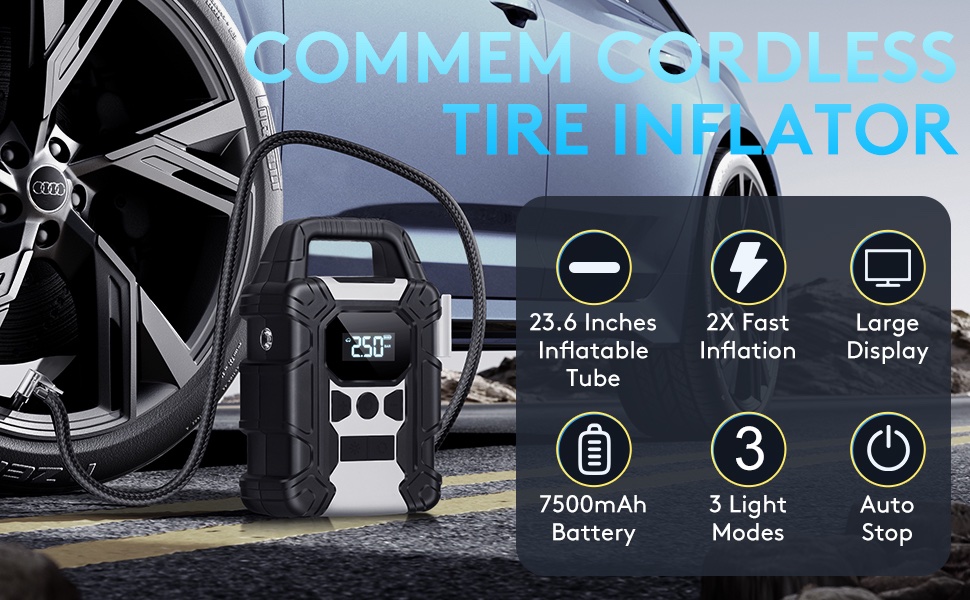 - Auto-Stop & Easy Operation: Simply connect the air hose to your car, use the “+” and “-” control buttons on the Commem to easily select your desired pressure, and press the middle “Start” button on the electric air pump. Once the correct pressure has been reached the tire inflator will automatically shut off. The cordless car tire pump makes it easy to reach all tires.