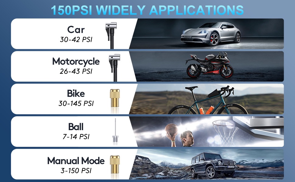 - Quick & Accurate Portable Air Pump: Built with the highest quality materials, Commem is a portable and handheld tire inflator for car, motorcycles, bicycles and balls. The maximum air flow of 45 L/Min, quickly inflate your vehicle’s tires in less than 5 minutes with precision accuracy up to 150 PSI. Small and compact car air pump that fits in your glove box or trunk.