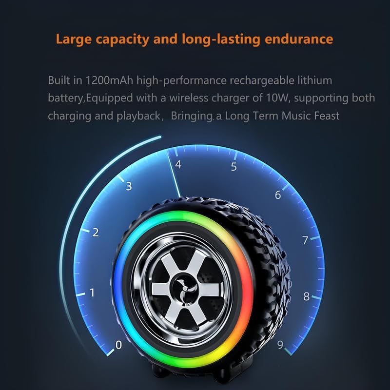 Tyre speakerPortable Wireless Bluetooth Speaker with Powerful Sound and Enhanced bass, offering 5 Hours of Battery Life. Includes a Built-in mic and is Compatible with iOS, Android, and laptops.DC